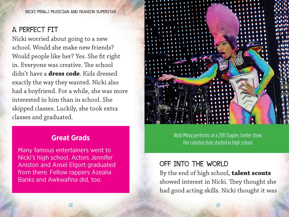 Award-winning Nicki Minaj is one of today's best-selling musical artists. Born in the Caribbean, then moving to New York, she thrills fans and music lovers with her catchy hip-hop tunes and high-energy performances. Readers will root for Nicki as they read about her early struggles growing up in a new country in an unhappy home, her first try at rap at age eleven, and her determination to succeed in a genre dominated by men. Nicki's own words and advice sparkle in this high-interest book, enhanced with exciting facts, sidebars, and a timeline. Lively color photographs accent the life story of this modern musical talent.