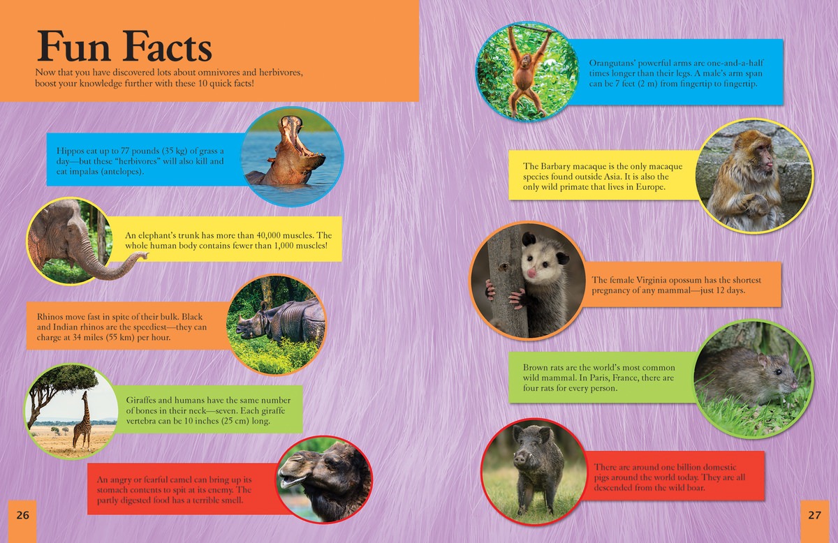 Treat readers to details about the diets that include meat and plants, and the diets that include only plants. Giraffes use their long necks to reach leaves they munch on all day, a key advantage for their herbivore diet. Pigs have such a strong sense of smell that they're able to detect animals that live underground, making them skilled omnivores. Through intriguing fun facts, vibrant photographs, and age-appropriate text, students will learn about the role food plays in the animal kingdom and understand why different animals have different feeding habits.
