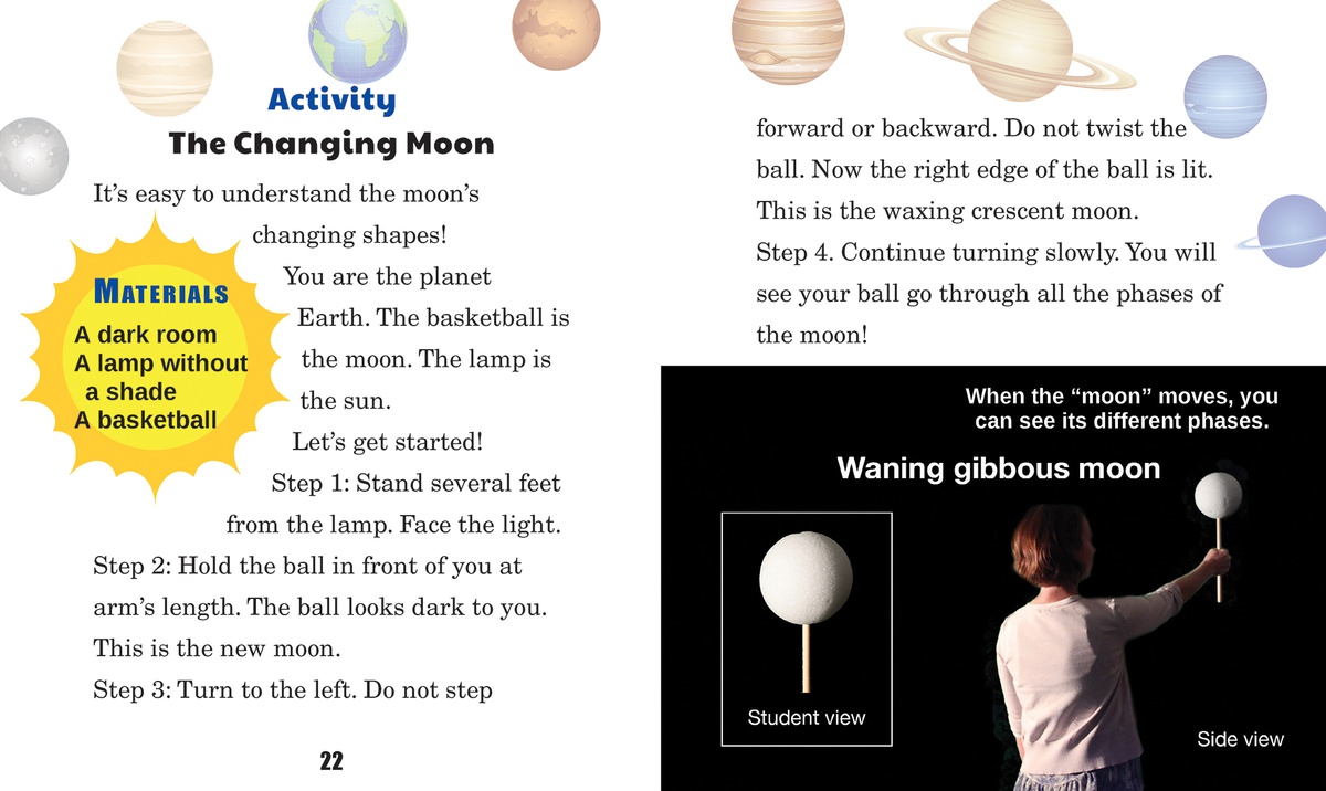 The sight of the moon in the night sky can be both familiar and mysterious. Readers are introduced to concepts such as the moon's rotation, orbit, and formation. They learn the basics of gravity, tides, atmosphere, and the phases of the moon. Fast facts, a hands-on activity, and eye-catching images capture readers' attention and enhance their understanding. This book correlates directly with the Next Generation Science Standards' expectation for understanding Earth's Place in the Universe in first and second grades.